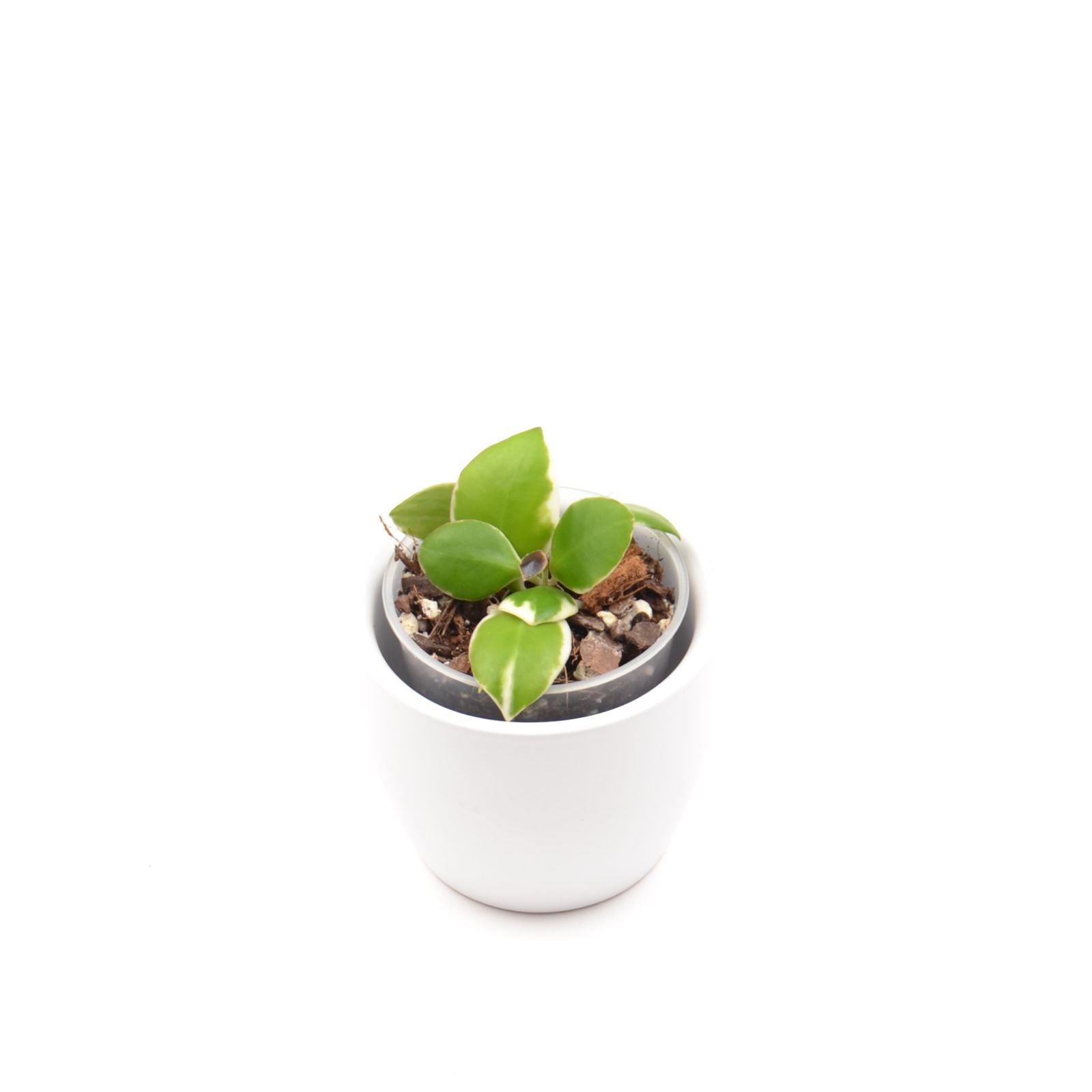 Die Hoya heuschkeliana (outer variegated) ist eine seltene, kompakt wachsende Hoya-Sorte, die sofort durch ihr außergewöhnliches Blattmuster auffällt. Ihre sukkulenten, wachsartigen Blätter zeigen eine elegante Panaschierung aus Grün und Creme. Mit ihrem dichten, hängenden Wuchs eignet sie sich perfekt für Ampeln oder kleine Regale.